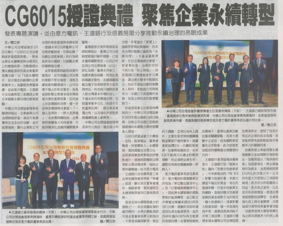 中華公司治理協會於3月31日舉行「CG6015公司治理制度評量授證典禮」,聚焦企業在永續轉型與治理深化上的實踐成果。活動邀請台灣永續能源研究基金會董事長簡又新,以「K型永續時代:從合規走向創價的企業新競爭力」為題發表專題演講,並由是方電訊、王道銀行及信義房屋三家獲證企業分享推動永續治理的實務經驗。